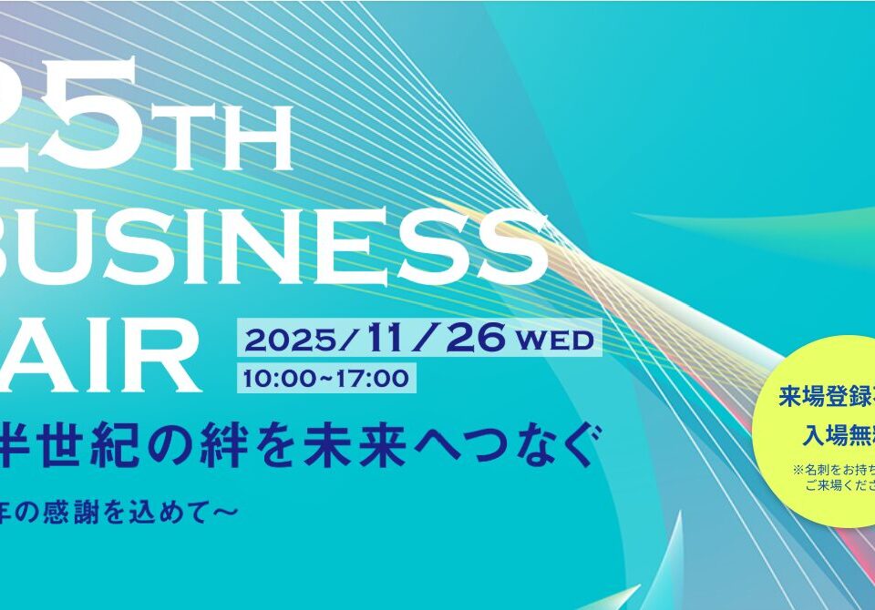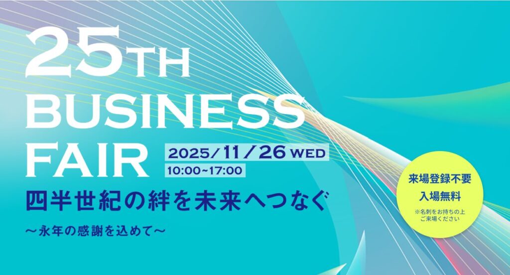 2025年11月19日 2025年11月19日第25回ビジネスフェア(新宿住友ビル 三角広場)への出展のお知らせ2025年11月26日(水)に新宿住友ビル 三角広場において「第25回ビジネスフェア 四半世紀の絆を、未来へつなぐ~永年の感謝を込めて~」が開催されます。弊社も […]